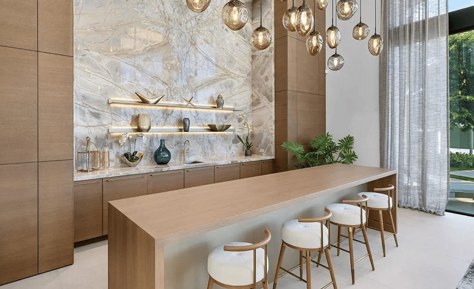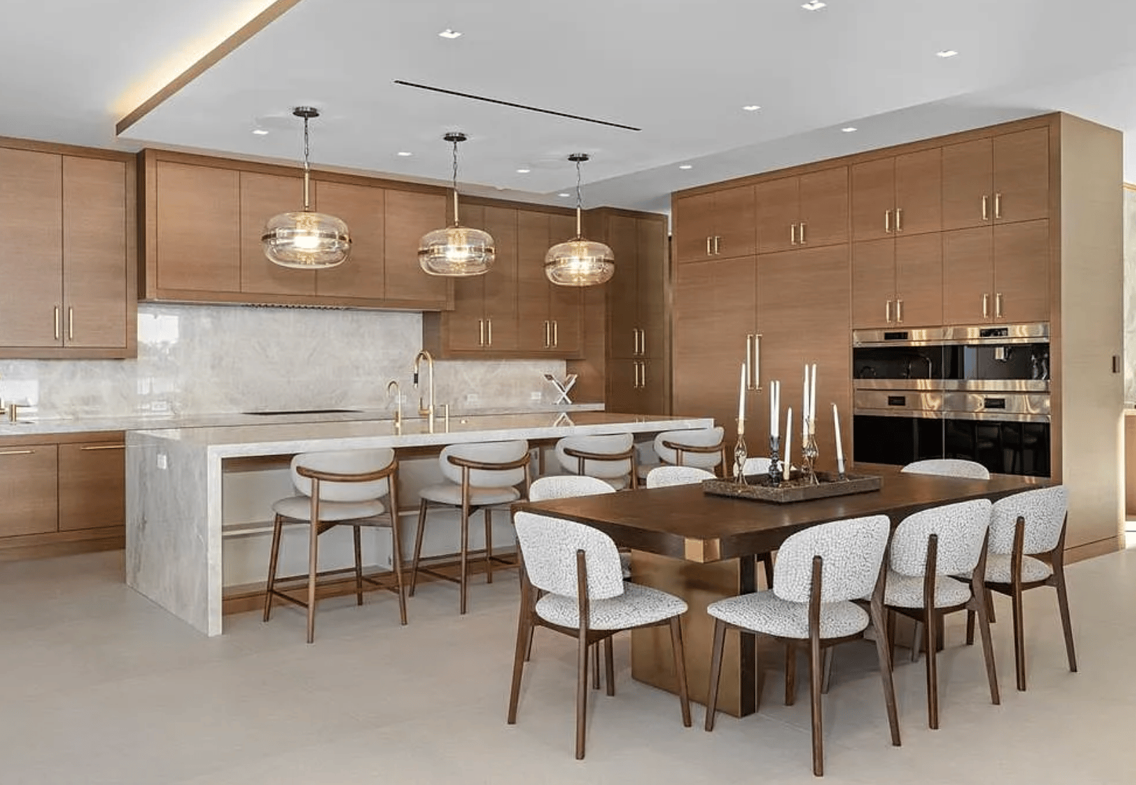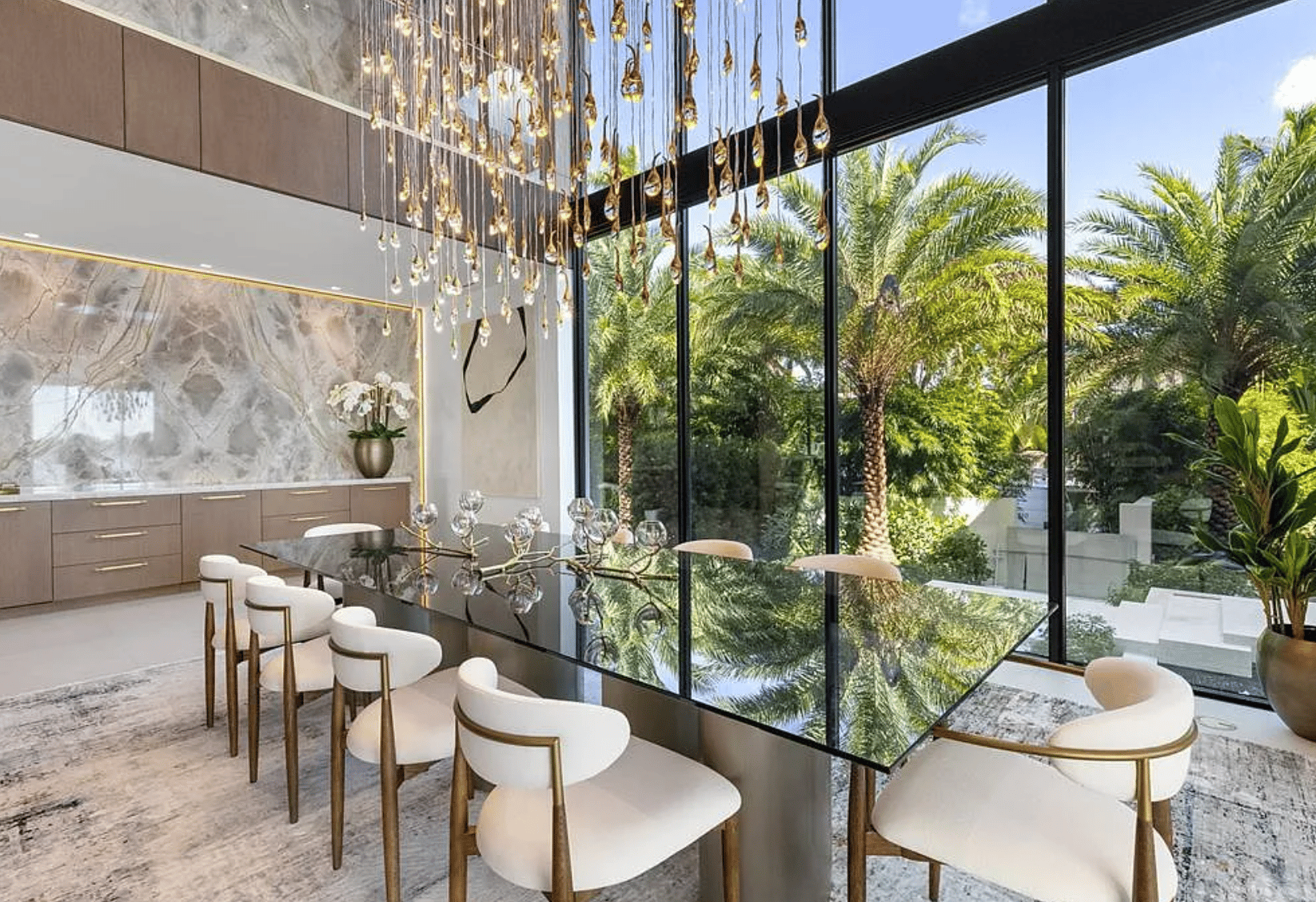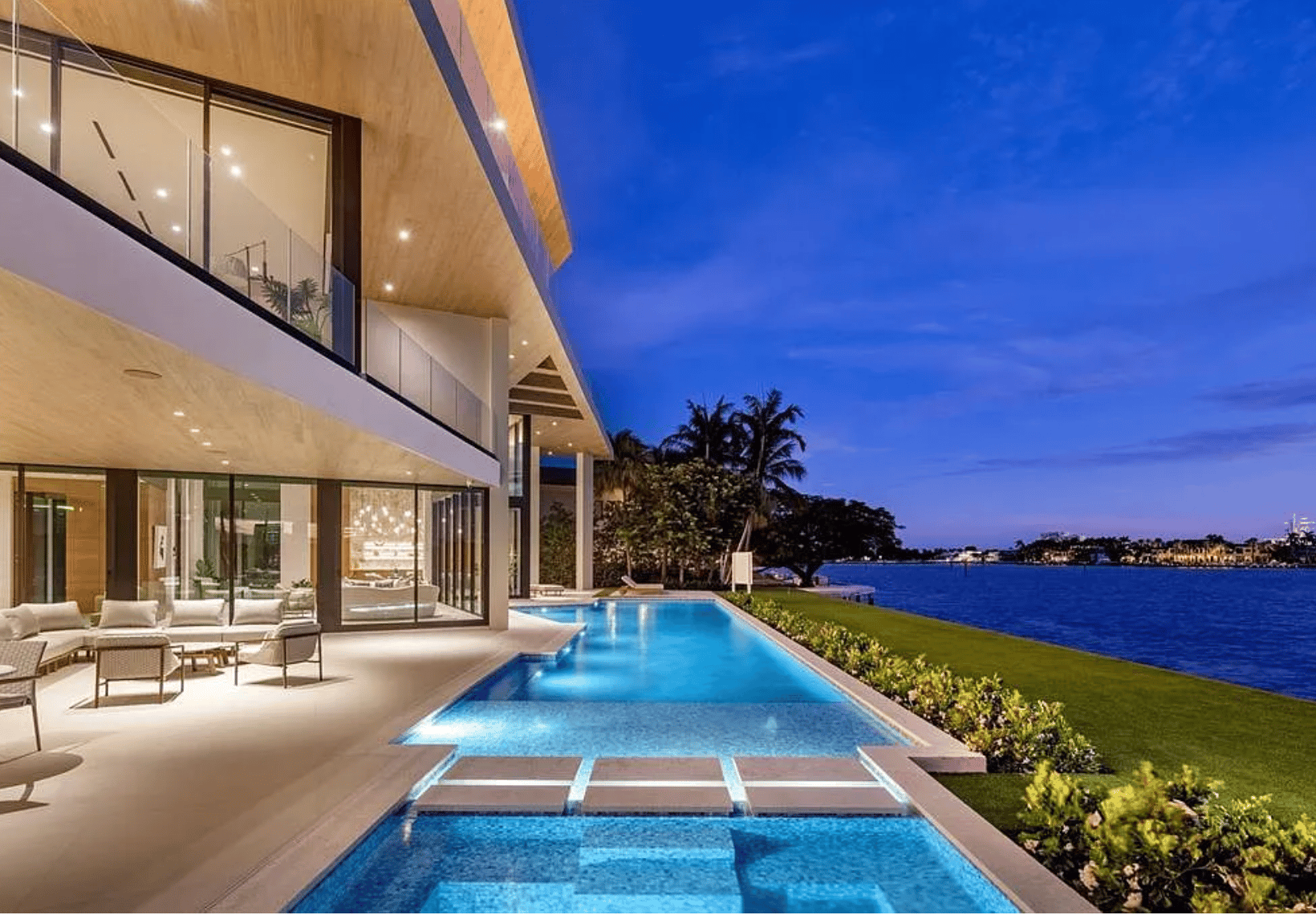Inside, Spanning over 10,000 sq ft of impeccably designed interiors, the home blends sleek contemporary architecture with natural warmth. Walls of glass frame the surrounding waterways, while rich oak millwork and Italian porcelain finishes elevate the elegant open plan living spaces.
